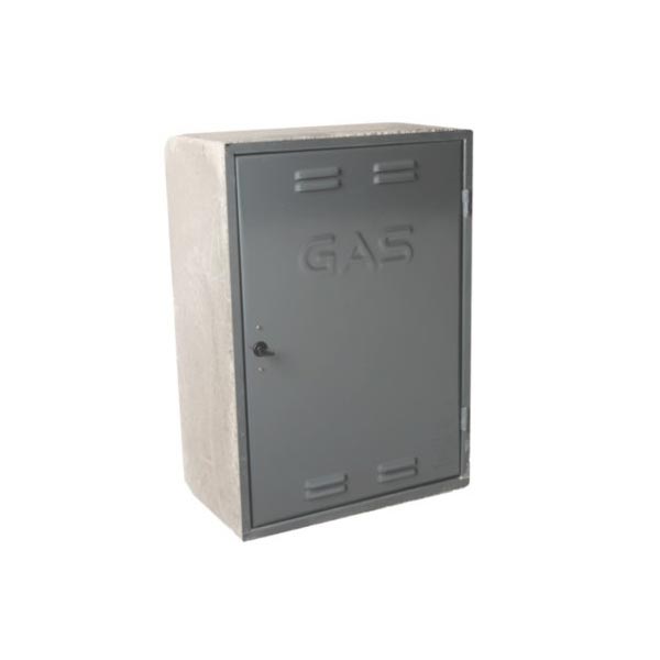 Gabinete Nicho de Gas aprobado, medidas 40 x 50 cm. Construido en cemento resistente con puerta de chapa, ideal para uso en exteriores. Incluye manija y ventilación adecuada para cumplir con las normativas vigentes. Diseño sólido y funcional, perfecto para proteger medidores de gas de manera segura y prolija.