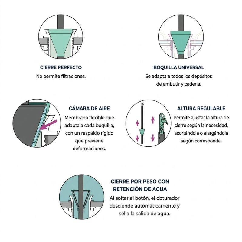 Está diseñado para reemplazar el obturador clásico con cierre de goma y es compatible con todas las descargas que poseen un orificio de 38 mm.