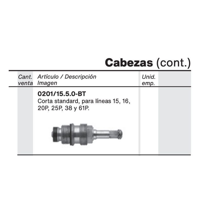 Vástago cabezal FV 0201/15.5.0-BT corto standard, repuesto original diseñado para griferías FV de las líneas 15, 16, 20P, 25P, 38 y 61P. Pieza fundamental para la apertura y cierre del paso de agua, garantizando un accionamiento suave y preciso. Fabricado con materiales resistentes de alta durabilidad, ideal para reparar pérdidas o desgaste por uso. Repuesto confiable, de excelente ajuste y fácil instalación.