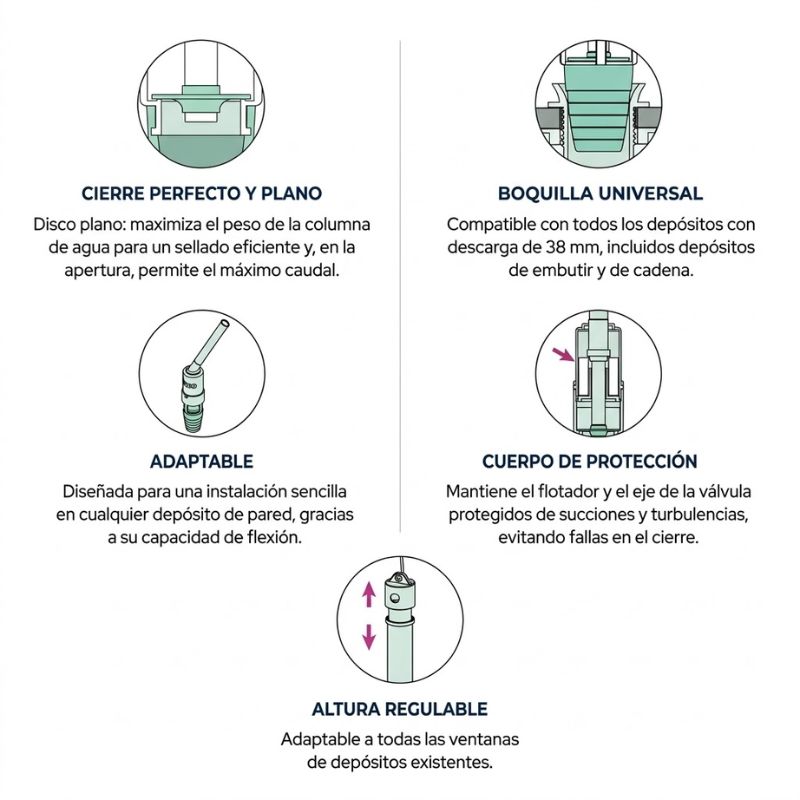 La válvula de descarga VD38 ha sido diseñada como reemplazo de la boya tradicional u obturador, ya que se ajusta al orificio de descarga, corrigiendo posibles imperfecciones de la misma. Además, cuenta con una cámara de flotación que permite la descarga total del agua, optimizando el barrido del inodoro.